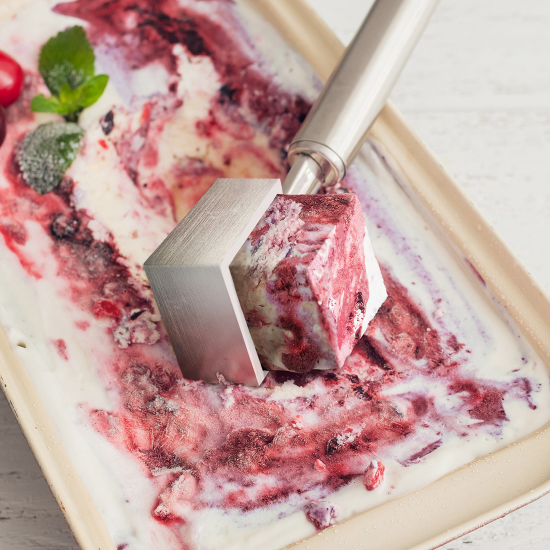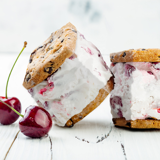 チェリーアイスサンドは北海道産のチェリーのアイスをサクサクのクッキーでサンドしたスイーツです。立方体なので大量に持ち運ぶときも便利です。
